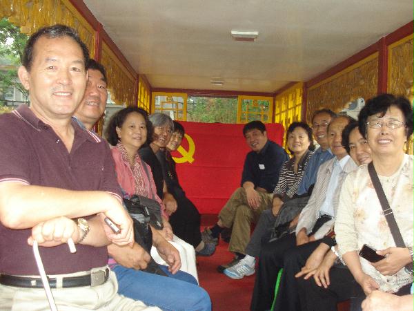 雨时下时停,同志们漫步园中亲切交谈。在游船渡口,大家登上了象征“南湖红船”,十几个人分坐两边,畅游湖中。碧荷湛绿,湖水荡漾,令人心旷神怡。在游船缓缓的划行中,齐沛同志向党员们介绍了学校贯彻十八大精神、改革发展的情况及对未来的设想,和自己学习十八大报告的体会,并逐一回答了大家关心的生活待遇等方面的问题;支部书记张兴元、邬荔荔同志分别介绍了“最美北京人——我们身边的雷锋”张开信同志的先进模范事迹,大家认真聆听,对张开信退休后继续发挥作用精神深感钦佩。