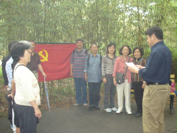 随即同志们步入园中,雨中的紫竹院清幽美丽,青松翠柏,绿草如茵。绿竹林中,此次活动最鲜明的特色是一面鲜红的党旗光彩夺目。微风细雨中,老同志们整齐的排成两行,在齐沛同志的带领下重温了入党誓词。