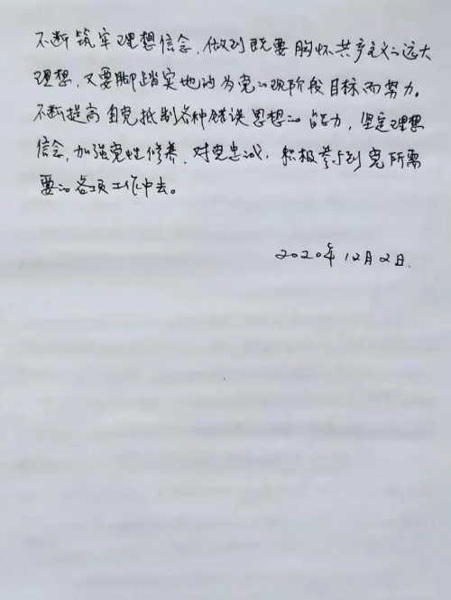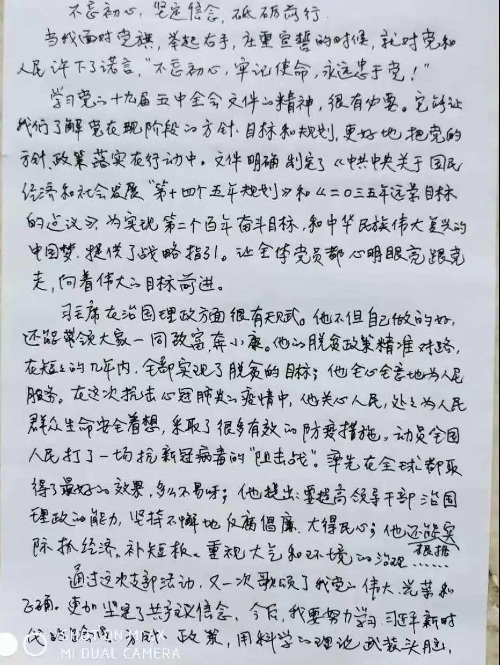 在党的领导下,我们国家越来越强大。作为一个中国人,一个普通党员,我无比高兴且自豪!党的十九屆五中全会给我们指明具体的奋斗目标,我一定会与党和国家同呼吸,共命运,按党的要求做好每一件事。不忘初心,努为奋斗。