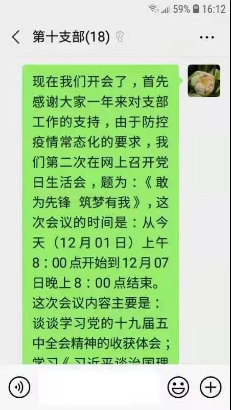 结合防控疫情常态化的要求,第十党支部于2020年12月1日至7日在线上召开“敢为先锋,筑梦有我”主题党日活动。支部十七位党员同志围绕党的十九届五中全会精神和《习近平谈治国理政》重要文件精神,结合防疫、脱贫攻坚等时政热点问题展开讨论。老同志们以语音、文字和视频等形式积极参与,踊跃发言,讨论热烈。
