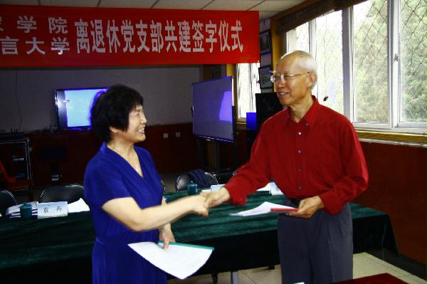 在签约仪式上北京语言大学离退休第28党支部书记杜厚文与北京农学院离退休第7党支部书记李晓玲签署了“共建协议书”。并代表各自支部表示了决心。支部双方将根据“协议书”内容规定,围绕“加强基层党组织建设,健全和完善高校基层党组织互帮互助机制,共同发挥党组织在推动发展、服务师生、凝聚人心、促进和谐,实现高校资源共享,互通有无、共同提高”等方面完成合作意向。