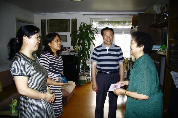7月18日,党委副书记赵旻同志在离退休工作处党总支书记袁丹、组织部副部长孙瑛的陪同下,来到归国侨眷、退休教师刘广徽同志家中,送去学校党委对她的问候和慰问金。赵旻同志亲切询问了刘老师的近期病情和治疗情况,对刘老师豁达开朗心态和在病重期间念念不忘学校学科建设和汉语国际推广的教材建设的精神给予鼓励。并再三嘱咐刘老师一定要好好休息,坚持科学治疗,身体恢复好后才能实现自己的梦想。