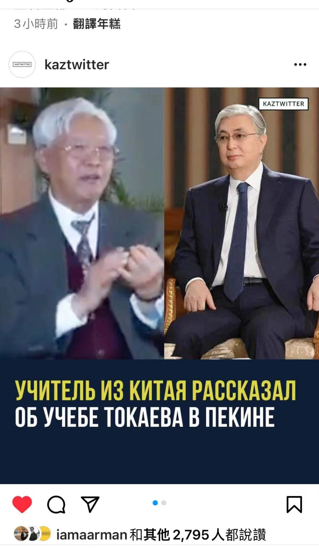 10月3日清晨5点半,急促的手机抖音把我惊醒。打开手机,两幅精美的照片跃入眼帘(见下图)。一幅是电脑合成的我与托卡耶夫总统同框的合影,另一幅是哈通社采访我的录像视频截图。照片上的金色俄文显示:“托卡耶夫总统的中国老师讲述他在中国的留学生活”。照片下面是北语校友、哈萨克斯坦KIMEP大学汉语高级教师嘉娜尔博士的短信:“老师好,今天是哈萨克斯坦的教师节,全网都是您的视频,您很火。祝您教师节愉快!”她还说,这两幅照片是官方发在推特上的。几小时内,阅读者达2795人。