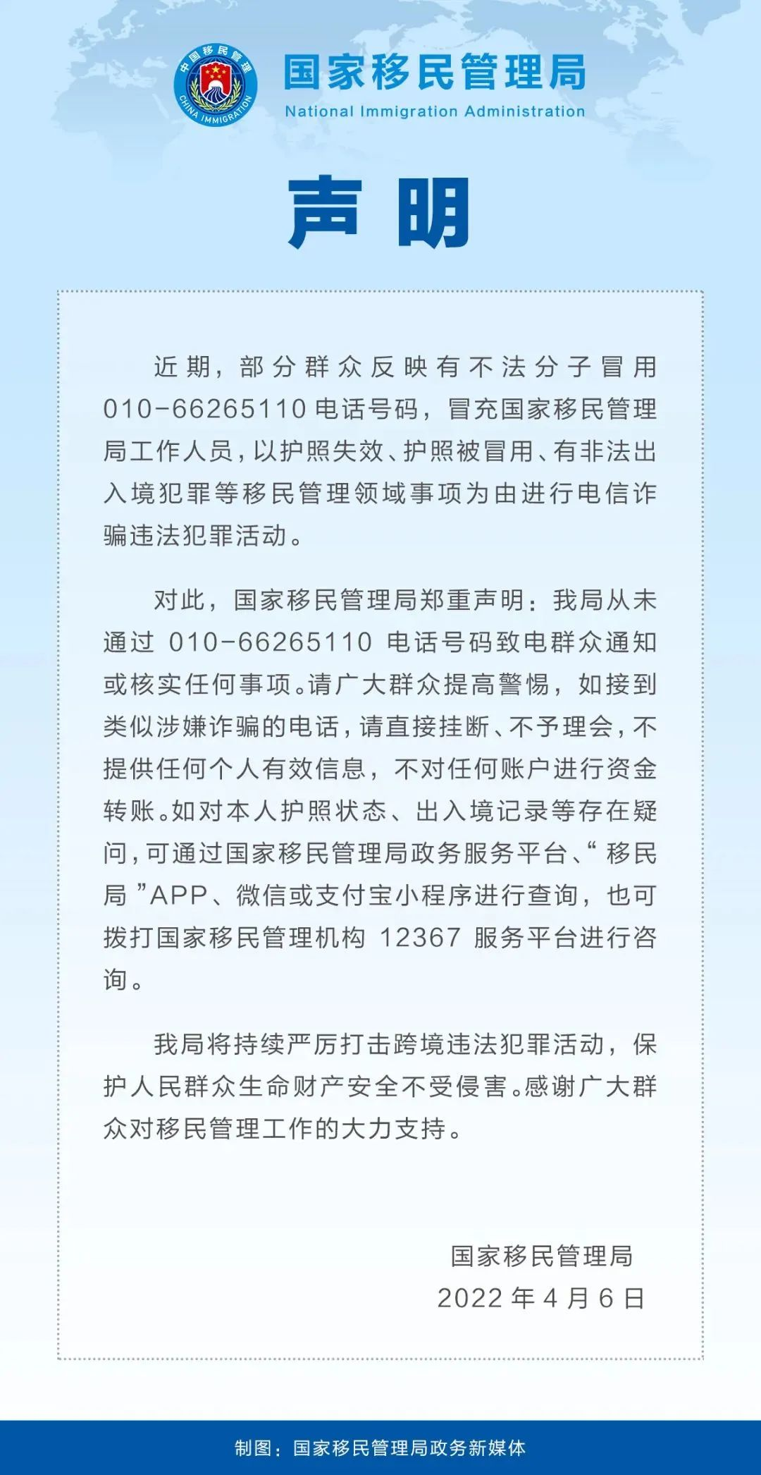 4月6日,国家移民管理局发布声明称,近期,部分群众反映有不法分子冒用010-66265110电话号码,冒充国家移民管理局工作人员,以护照失效、护照被冒用、有非法出入境犯罪等移民管理领域事项为由进行电信诈骗违法犯罪活动。
