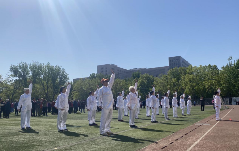 阳光普照下的绿茵场地,离退休工作处太极队合着音乐为大家呈现了一段精彩的太极功夫扇表演。太极招式如高山流水,红扇挥舞舒展自如。整齐划一的动作,专心致志的神情,充分展现了老同志们热情饱满、健康向上的精神风貌。