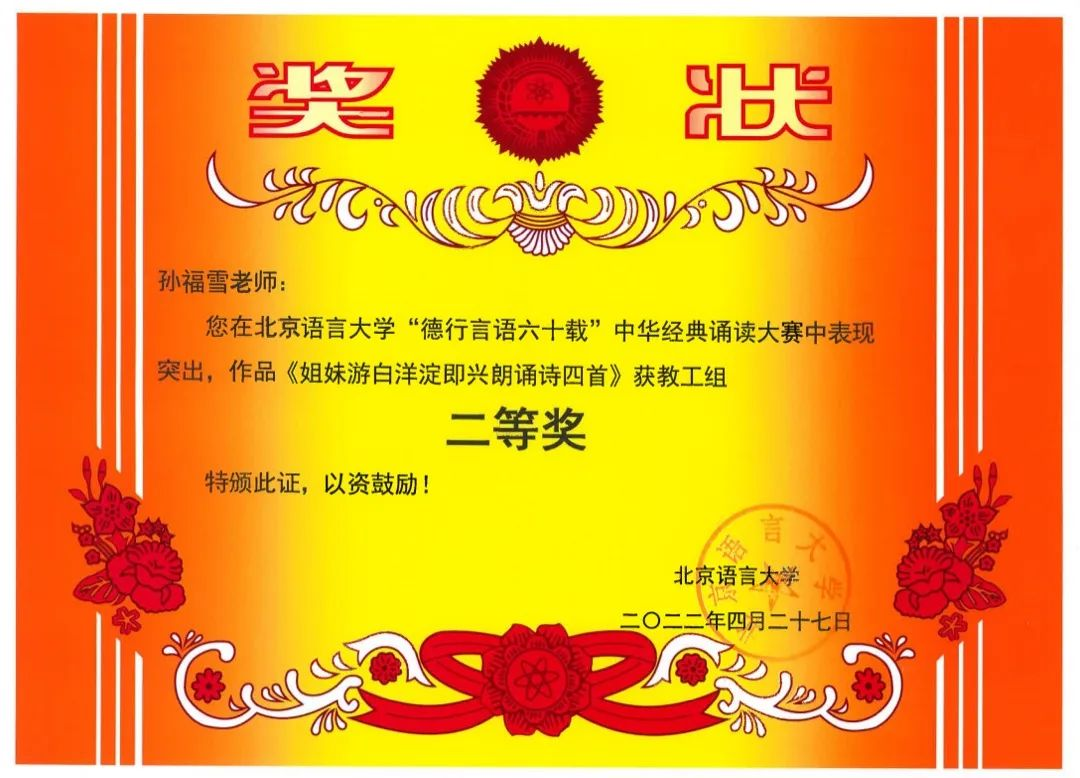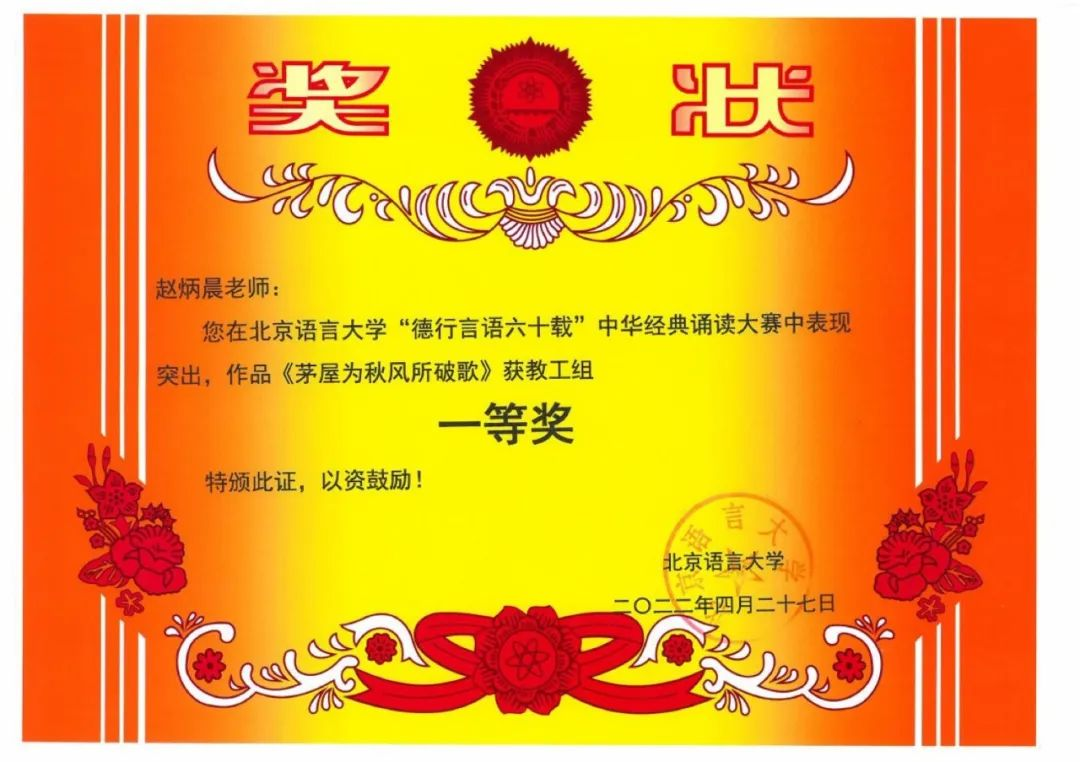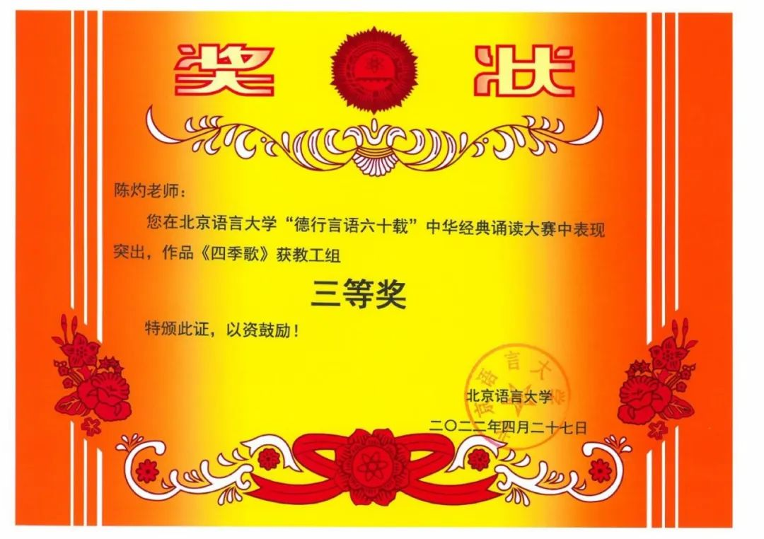 在北京语言大学“德行言语六十载”中华经典诵读大赛中,赵炳晨老师的作品荣获一等奖,孙福雪老师的作品荣获二等奖,陈灼老师作品荣获三等奖。
