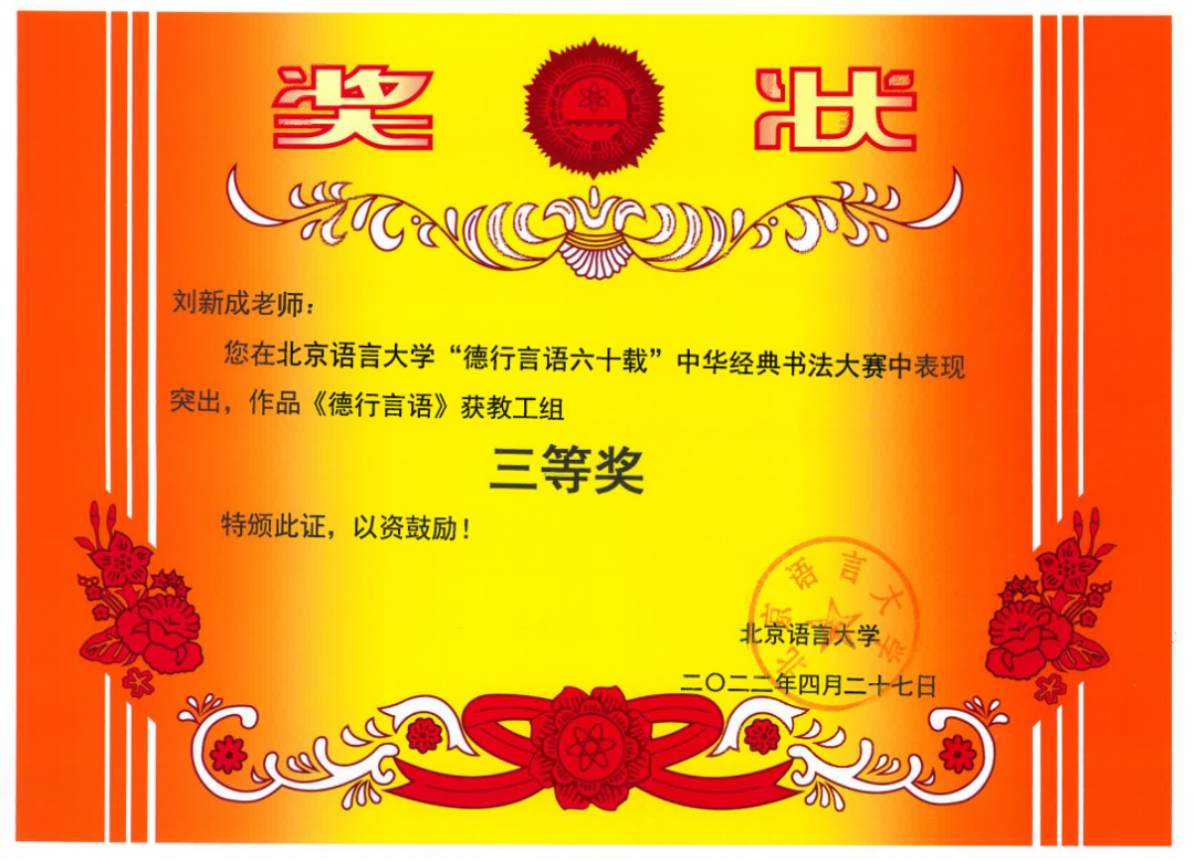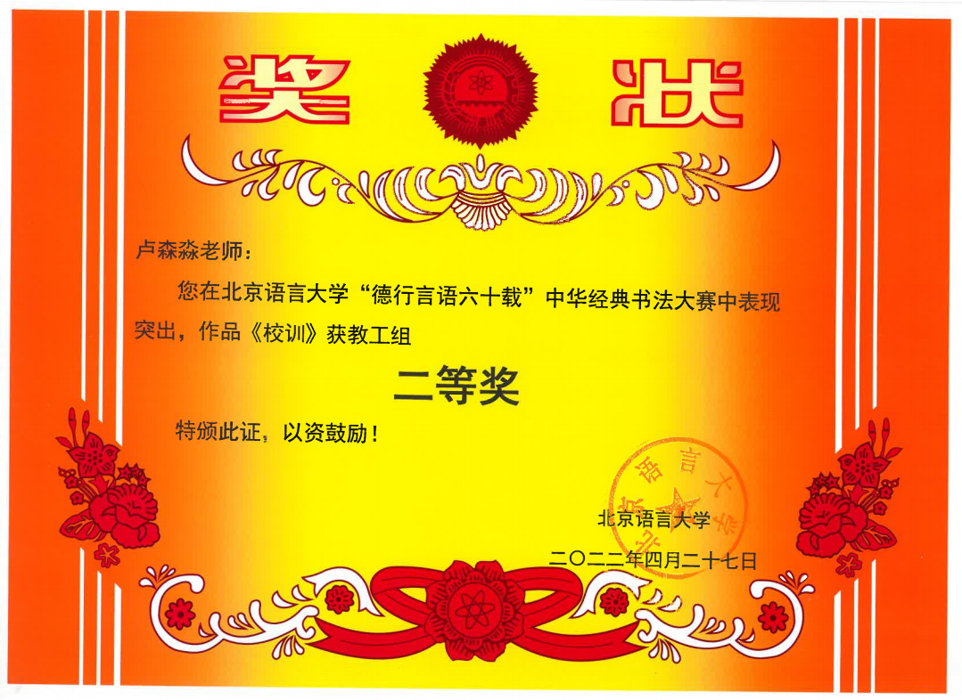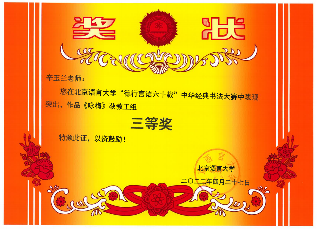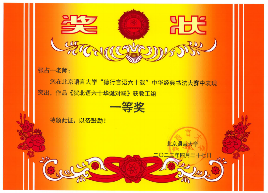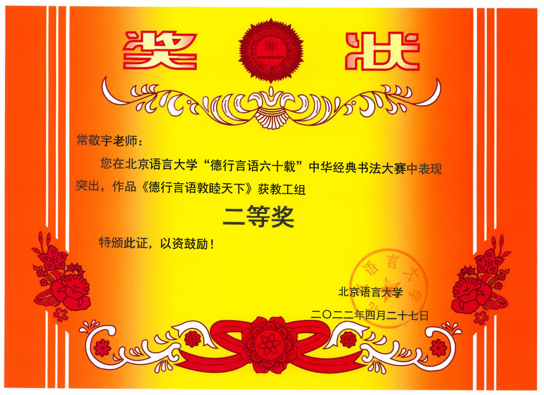 在北京语言大学“德行言语六十载”中华经典书法大赛中,张占一老师的作品荣获一等奖,常敬宇、卢森淼老师的作品荣获二等奖,刘新成、辛玉兰老师作品荣获三等奖。
