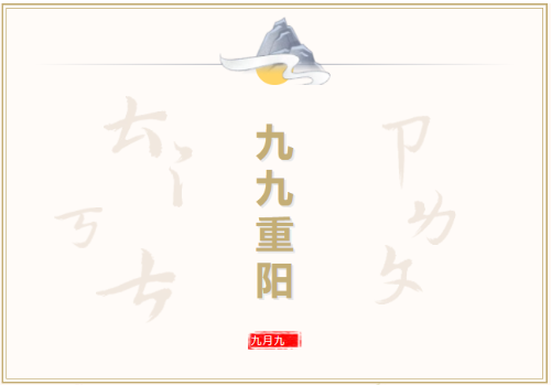 重阳节,是中国传统节日,节期为每年农历九月初九。起始于上古,成型于春秋战国,普及于西汉,鼎盛于唐代以后。“九”数在《易经》中为阳数,“九九”两阳数相重,故曰“重阳”;因日与月皆逢九,故又称为“重九”。九九归真,一元肇始,古人认为九九重阳是吉祥的日子。古时民间在重阳节有登高祈福、秋游赏菊、佩插茱萸、拜神祭祖及饮宴祈寿等习俗。