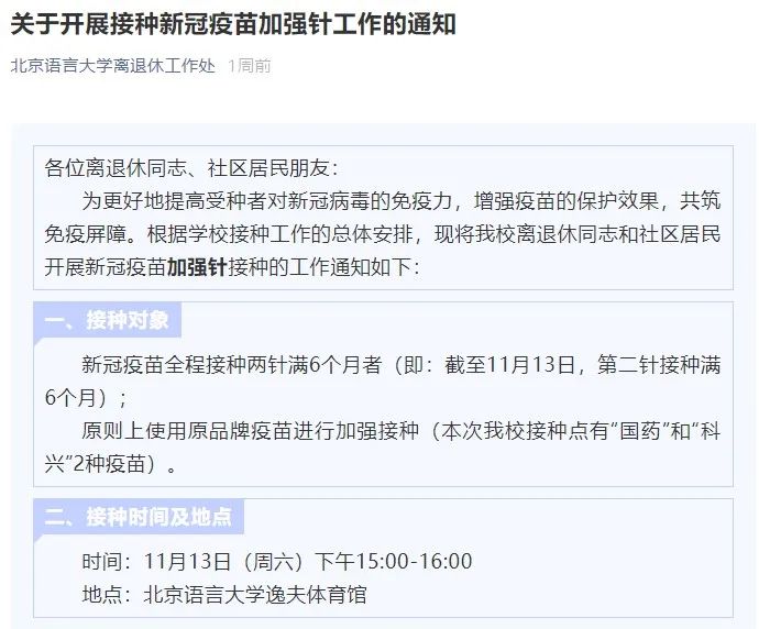 为确保本次新冠疫苗加强免疫接种工作顺利进行,离退休工作处(居民管理处)多次与校医院等单位进行沟通,确定相关事项,提前发布疫苗加强针接种通知及注意事项。