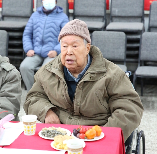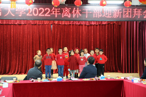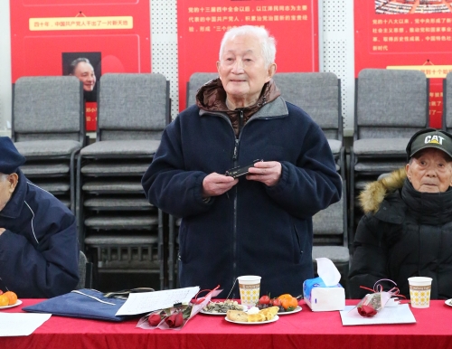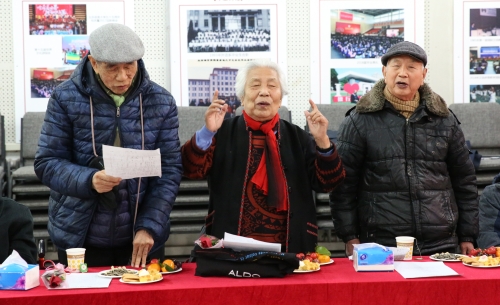 董海波、任宣之、田士琪三位离休老干部通过视频向大家传达祝福之意,同时,对学校一直以来对老同志的关心重视、离退休工作处对老同志的关心和照顾表示感谢。唐传寅老师即兴演唱“让世界充满爱”和京剧选段,刘素珍、刘国桐、沈明德三位离休老同志合唱“社会主义好”和“解放军的天”,王俊朗老师即兴朗诵毛主席词作《沁园春·雪》,各位离休老同志的热情感染了在场的每一个人,温暖了严寒的冬日。