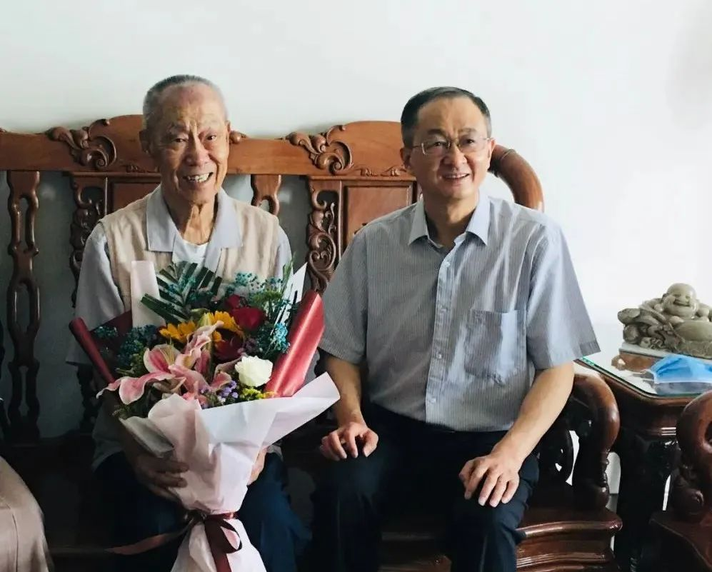 魏晖副书记向董海波老师赠送了鲜花和生日蛋糕。董海波老师虽已百岁高寿,但精神矍铄、思维清晰、康健硬朗、行动自如,他也一直关心关注学校的事业发展。董海波老师深情回忆起当年他在抗战时期以及从事教育工作时期的情景,他感恩党的培养,感谢学校一直以来对他的关心关怀。党龄已76年的他说:“我从小受家庭影响,20多岁加入共产党,不管是抗战还是革命建设,我始终跟随党,因为党是为了人民,为了中华民族的伟大复兴才抗战、革命的。回想以前,中国人民生活极为贫困,吃不饱饭,太艰难了,现在虽然我们国家依然会面临一些挑战,但是我们国家已经强大起来了,中国大地上发生了翻天覆地的变化。感谢党的领导,没有党的坚强领导,指引方向,就没有今天强大的中国。”