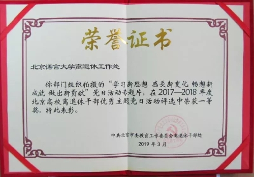 3月19日,市教工委离退休干部处召开2019年北京高校离退休工作部门负责人会议,对优秀信息工作单位、优秀主题党日、优秀报刊单位和主题活动优秀组织单位进行表彰。由我校离退休工作处主办、面向离退休老同志的刊物《霜叶》被评为优秀报刊。我校离退休工作处与北京农学院离退休工作处共同策划、开展的《学习新思想 感受新变化 畅想新成就 做出新贡献》主题党日活动在本次评选中荣获一等奖。