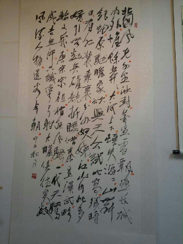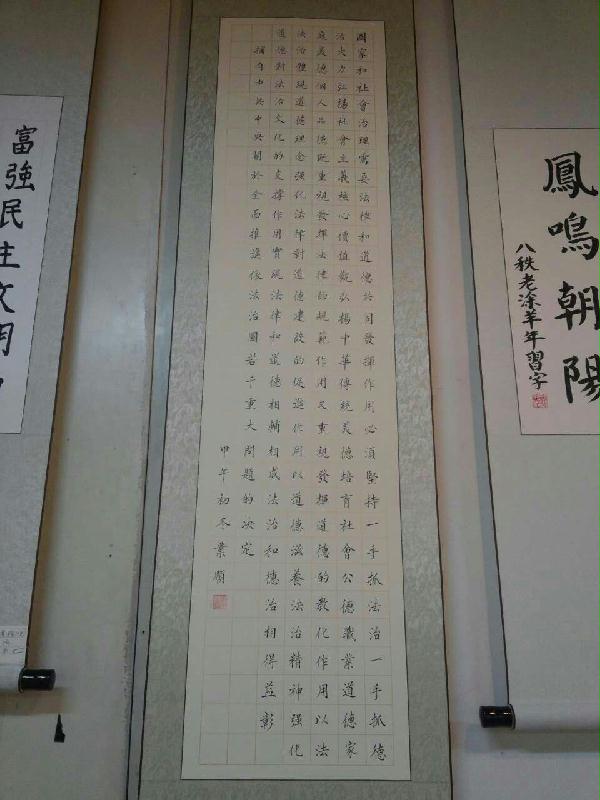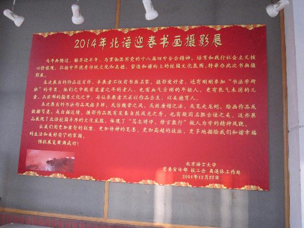 本次展出的作品近百件,书法作品风格多样,或仿魏晋之风,或效唐楷之法,或笔走龙蛇,挥洒泼墨;绘画作品或皴擦写意,或白描达情,以丹青彩绘抒怀;摄影作品既有采集自然风光之秀,也有凝固名胜古迹之美。这些展品充分体现了北语和谐、健康、优美的校园文化氛围。参展者不仅有我校书画名家、摄影爱好者,还有刚刚参加北语“书法学研班”的学员,他们之中既有耄耋之年的老人,也有血气方刚的年轻人,更有乳气未消的儿童。在浓郁的翰墨文化之中,每位参展者以作品会友,力图以睿智的创意、传神的笔墨、高超的技法,淋漓尽致地描绘我们和谐幸福的生活和美好安宁的家园。