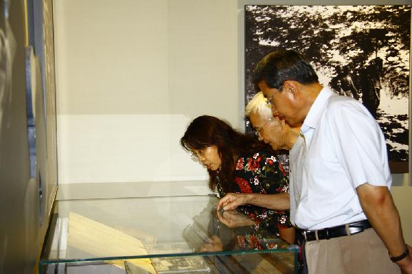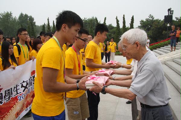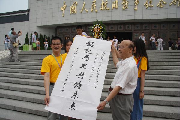 北京语言大学关心下一代委员会副主任、原校党委副书记李连科同志代表学校关工委为”我的中国” 京港澳学生交流营赠送写有“铭记历史,共铸未来”的字画,并与两名年逾八旬的抗战老兵李玉锁、潘末全同志一道向来自北京、香港和澳门的三地营员代表赠送“重温抗战家书”,以此勉励青年学生发奋学习,勿忘国耻,珍爱和平,为中华民族的强盛而努力奋斗。