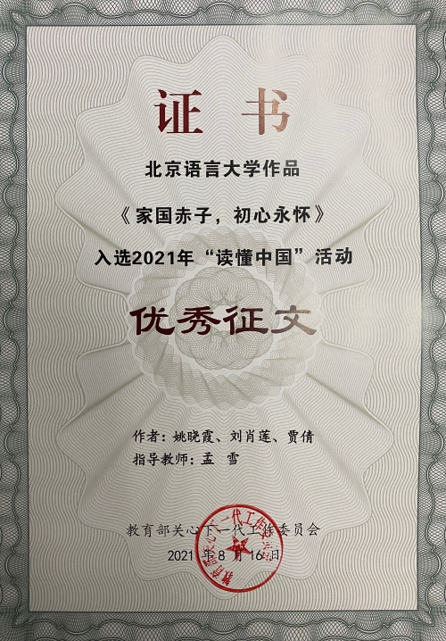 近日,我校关工委推选作品《家国赤子,初心永怀》、《翻译事业中的“小小螺丝钉”》被评为教育部关心下一代工作委员会2021年“读懂中国”活动优秀征文。