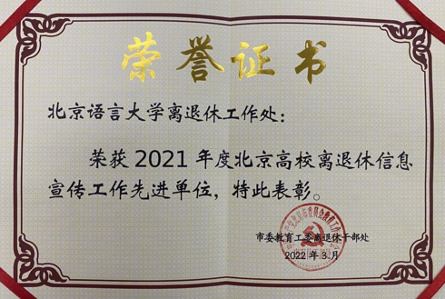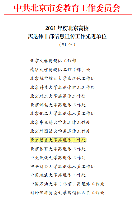 近日,北京市委教育工委离退休干部处通过对各高校信息报送和宣传工作的综合评定,共评选出了31所高校离退休工作部门予以表彰,我处荣获“2021年北京高校离退休干部信息宣传工作先进单位”称号。