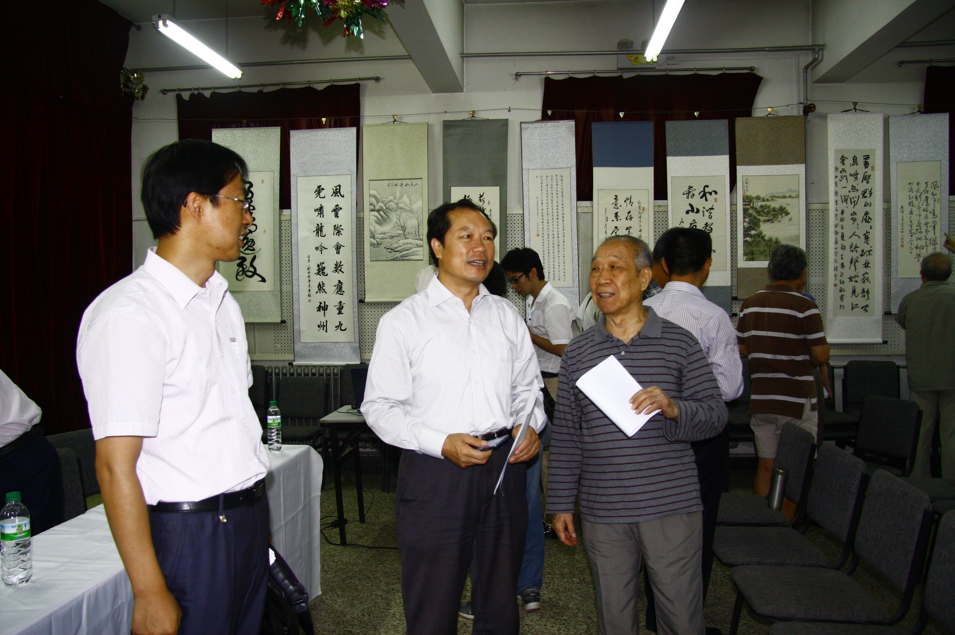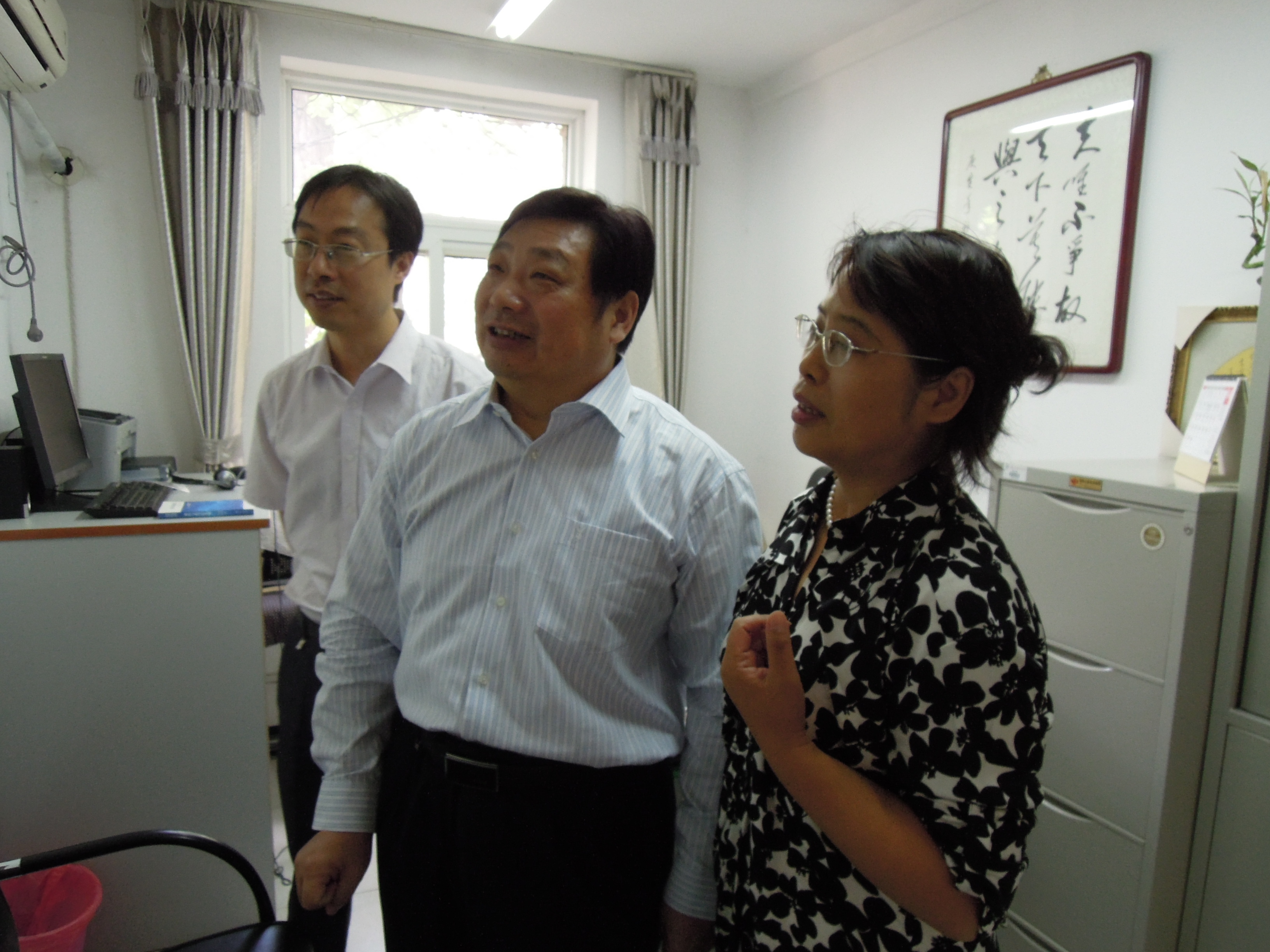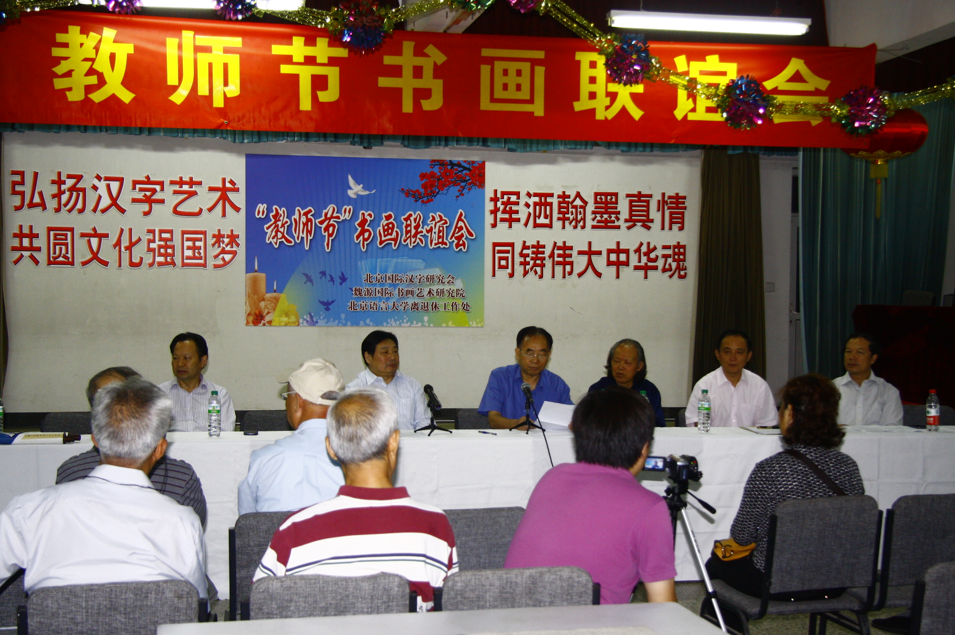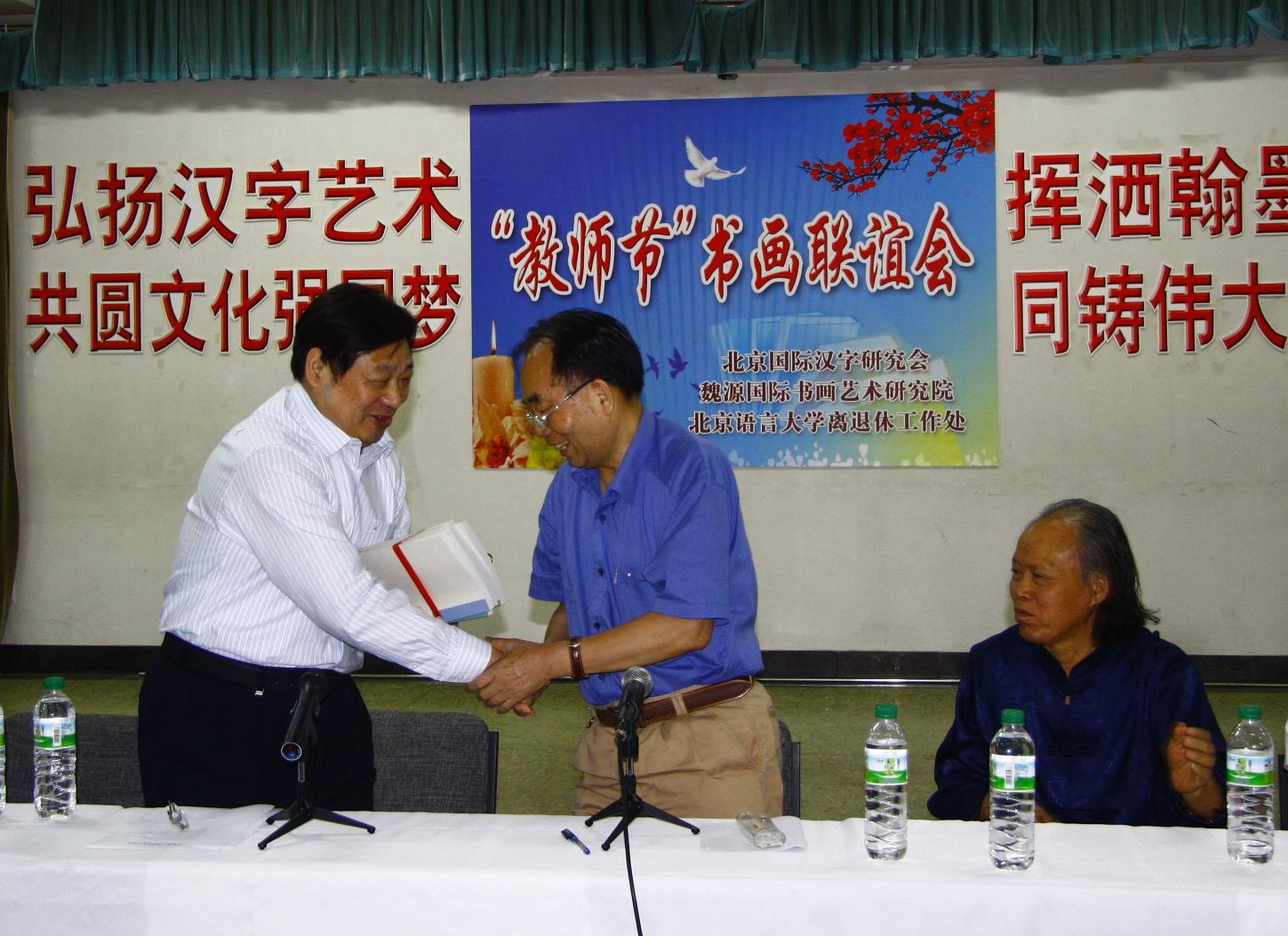 2013年9月9日上午,由离退休工作处枫叶书画社、北京国际汉字研究会、魏源国际书画艺术研究院共同举办了“教师节”书画联谊会。李宇明书记和赵旻副书记参加“‘教师节’书画联谊会”。李宇明书记在致辞中,对魏源国际书画艺术研究院书法家和我校离退休同志的书法艺术给予了高度的赞赏,并以热情洋溢的讲话表达了学校党委和他本人对我校离退休教职工关心与关注,祝大家教师节快乐!校组织部长兼人事处处长刘伟、校党政办公室主任黄益方也参加了此次活动。