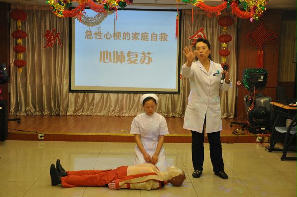 在宣传教育环节,校医院的医护人员用情景剧的方式和对仿真人的抢救示范等形式向离退休老同志进行家庭救护知识的宣传普及。使在场的老同志了解到,在家里一旦出现心脑疾病的患者,如何呼救和施救。