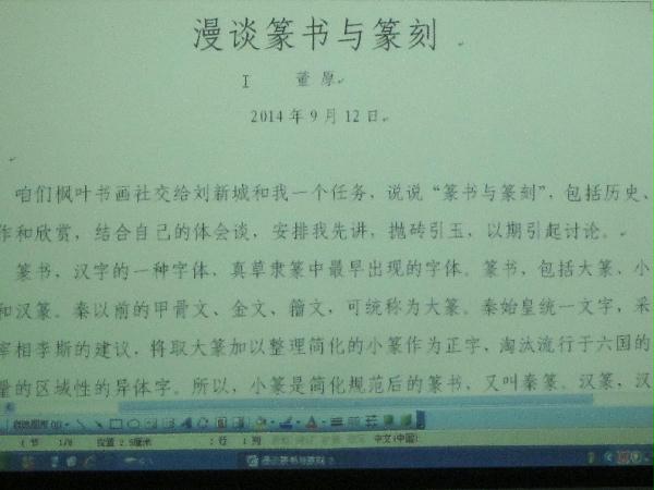 10月23日上午,枫叶书画社举办了一次篆书与篆刻知识漫谈活动。此次活动专门邀请了董原和刘新成两位老师主讲。活动中,董原老师首先发言,他先向大家详细地介绍了篆书的历史及发展。董老师说,篆书是汉字的一种字体,包括大篆、小篆和汉篆。秦朝以前的甲骨文、金文、籀文统称为大篆。秦始皇统一文字,将大篆整理简化,称为小篆,也叫秦篆。汉篆是小篆向隶书过度的一种书体,古朴、方正、谨严。笔画似小篆,字形含隶意,是治印典型的字体。接着,董原老师还介绍了篆刻的有关知识。他说,学习篆刻首先要会识篆、写篆,然后才是刻篆。刻篆也是写篆,是用刀写篆。写篆是手段,刻篆是目的。学篆书并不难,篆书只有横、直、弧三种笔画,好记好练。董原老师还跟大家分享了自己的学习经验:习篆首先要选好字帖,他开始学习的时候,选用的是石鼓文和袁安碑。最后,董老师还简要地介绍了中国的篆刻史和厉代的篆刻名家。