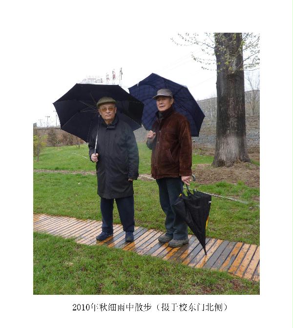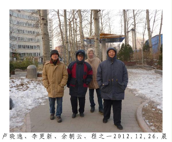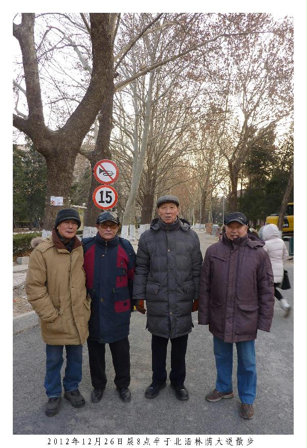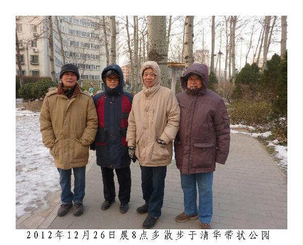 退休之后,见卢兄和李更新、张占一等同志一起散步,非常开心,也就参加了这支队伍。我们每天上午8点,出北门,走清华带状公园向东转南,进学校东门,顺林荫大道直至原处15号宿舍楼前,然后各自回家。天天如此,风雨无阻,成了一个小群体,又被称为“小步队”,散步的小队伍。我们边走边聊,海阔天空,无所不谈。将其视之为健身怡神的手段,戏称“足疗”和“话疗(聊)”。如果从2005年算起,已坚持8年之久。