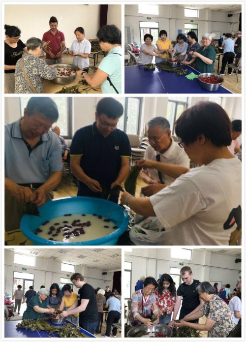 活动中离退休工作处罗立祥处长与居民共同参与体验活动。很多居民都是包粽子高手,他们手把手教授外国留学生包粽技巧。有些居民还一边包粽子一边向年轻人讲述端午节的来历和习俗。
